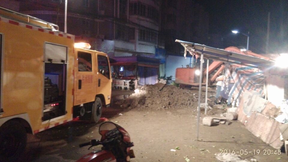 抢修人员到达现场后,立即关闭该段管道阀门,由于该处管道管径大且开挖处多高大树木和私建工棚,施工难度大。为确保抢修进度,我司投入了十几名的抢修人员、挖掘机和多功能抢修车投入抢修。