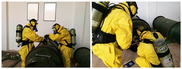 安全生产不放松。二水厂近日在加氯间氯库开展氯气泄漏抢修练习。开军带领新职工汪龙,佩戴空气呼吸器,穿好防化服,携带氯瓶抢修专用工具,进入氯库。一是对抢险工具、抢险器材、装备的熟练程度进行练习。二是氯瓶角阀泄漏练习。三是氯瓶瓶身泄漏抢修练习。经过反复练习使二水厂职工熟练掌握抢修工具的使用方法,增强员工的安全用氯意识及遇到重大事故时的心理素质。