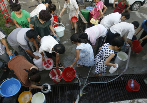 市民们聚集在一起打水