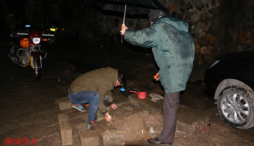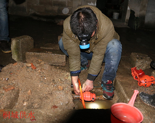为缩短抢修时间,五位维修师傅带着随身的抢修器材和工具,冒雨直奔现场,立即投入抢修,关闭管理阀、开挖工作坑、对接水管等工作流程紧张有序,忙而不乱地进行着。由于受环境限制,无法佩戴手套操作,师傅们徒手在水中维修。经过长达两个多小时的努力,在晚间十点半恢复了正常供水。