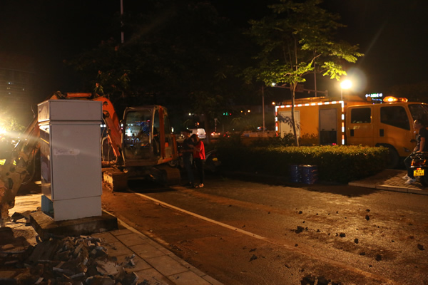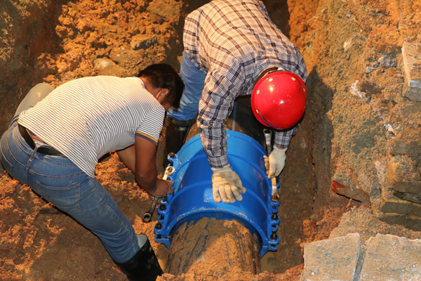 盛唐南路国际广场处爆点周边环境复杂,水管位于电信电缆井和控制箱体下方,与电信电缆、液化气管道交织在一起,无法直接使用机械施工。为节约抢修时间,抢修人员采取人机相结合的方式,同步开挖爆管两端区域,从电缆井和控制箱下方穿行更换爆管。在电信和液化气公司等相关单位积极指导配合下,经过近8小时的奋战,于夜间11点30分恢复供水。