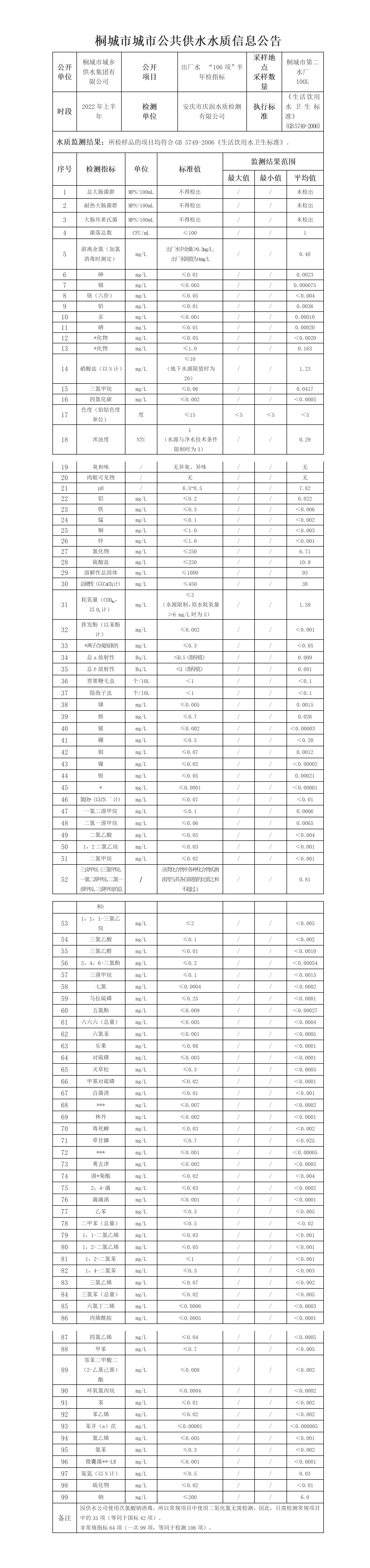 桐城市城市公共供水水质信息公告(出厂水106项半年检指标2022年上半年)